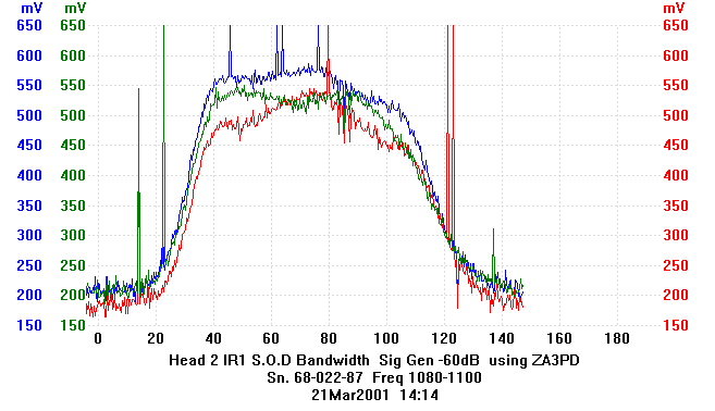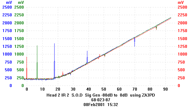 圖1.頭1動(dòng)態(tài)水平范圍測(cè)量的樣本,顯示接收器的良好線性。 為了在dB縮放中進(jìn)行校準(zhǔn),“設(shè)置 - 自定義范圍”的選擇允許縮放dB刻度中包含的mV數(shù)。 我選擇250mV = -100 dB和2250 mV = -30 dB作為表示線性dB /毫伏標(biāo)度的標(biāo)度。這將給出與信號(hào)發(fā)生器輸出相關(guān)的dB值的近似值。 考慮到-20 dB衰減的耦合器,其次是每條-3 dB的Mimi Circuits ZA功率分配器,以及0.3 dB至2 dB的電纜損耗,每個(gè)接收器的總損耗約為-29 dB。 要在繪圖儀上注冊(cè)-84 dB的值,則必須從信號(hào)發(fā)生器輸出-55 dB的電平。 通過選擇每增量10dB的更大增量分辨率,也可以使用步進(jìn)法。這將很容易地顯示繪圖儀上信號(hào)發(fā)生器輸出連續(xù)10dB增加所產(chǎn)生的電平。 任何偏離正確的斜率或步驟都可以立即識(shí)別,并且可以開始對(duì)該接收器進(jìn)行更集中的檢查。
