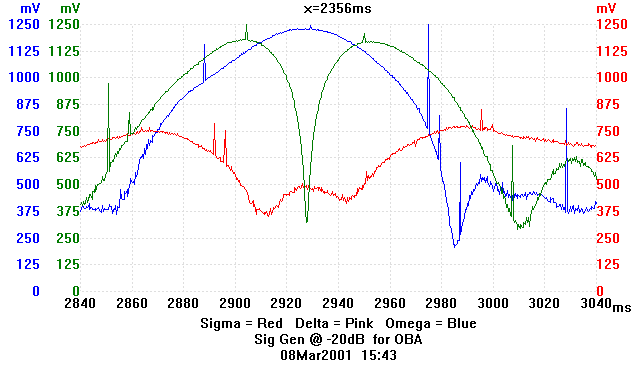 圖3:在測(cè)試波束天線上觀察SW的Head 1 HPD測(cè)量樣本 通過檢查Sigma和Delta波形之間的交叉點(diǎn),可以對(duì)天線系統(tǒng)的質(zhì)量進(jìn)行評(píng)估。 它們需要符合2.5度的波束寬度,并且與Sigma波形的峰值相差3 dB。 可以放大光束的最佳位置并對(duì)交叉進(jìn)行毫伏測(cè)量。 通過仔細(xì)選擇每毫伏30毫伏的刻度值,從250毫伏到2250毫伏的范圍,X軸可以以dB為單位進(jìn)行校準(zhǔn),這是射入測(cè)試波束天線的最大射頻電平。