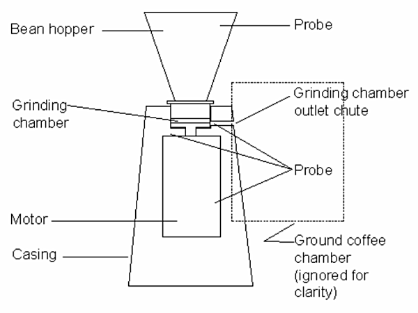 測試設置 典型的咖啡研磨機的實際研磨室非常小并且自由空間很小。為了使溫度探頭進入這個空間而不干擾咖啡的流動,從而扭曲結果,證明是一個挑戰。最終使用“細線,外露結”K型熱電偶。用少量的環氧樹脂將其粘合到研磨室出口中,以提供通過研磨機外殼的金屬傳導的任何熱量的絕緣,同時使接合處暴露于研磨咖啡。探針線通過研磨咖啡出口滑槽從腔室中送出。 第二個探頭連接到電動機定子的側面,以檢測實際電動機的熱量上升。這里使用粘合到柔性磁墊的“細線,暴露結”K型熱電偶。這使探頭與電機定子的軟鐵保持接觸。 將第三探針連接到研磨機殼體的金屬上,該金屬與電動機用螺栓固定在研磨室正下方的研磨機主體的點附近,以顯示來自電動機的傳導熱量。 最后,將皮下注射型探針插入咖啡豆料斗的底部,以在進入研磨室之前監測咖啡豆的溫度。 下面的圖1顯示了咖啡研磨機的示意圖和熱電偶的位置。 為了復制“咖啡店”條件,使用溫控室。將其設定為28攝氏度和平均濕度水平。 使用連接到PC的USB TC-08,在10分鐘內收集數據,每500 ms讀取一次。測試進行三次并比較結果。三次測試的結果非常接近,沒有平均值,只使用了一組。