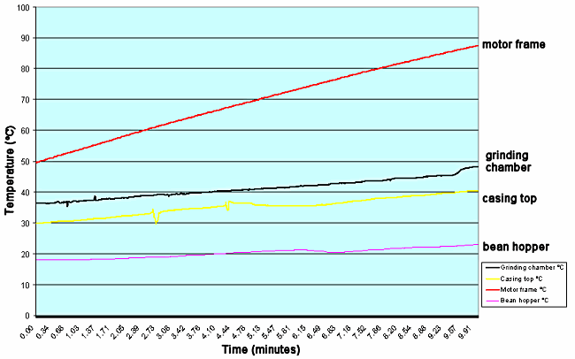 商用咖啡研磨機通常具有高的工作循環,特別是在研磨咖啡室完全空的交易日中的第一件事(不幸的是,大多數研磨機設計為大約30%的工作循環)。此時,研磨機必須在短時間內產生高達1千克的研磨咖啡,同時將絕對最小的熱量傳遞到研磨咖啡中。由于這些機器通常具有相對小的外殼尺寸,但是包含強大的電動機,轉速大約為1,200rpm,因此從電動機向上進入研磨室的熱量存在很大的風險。研磨作用本身也產生熱量。測試咖啡研磨機的目的是識別并最小化所有不必要的熱量。希望從測試結果中可以計算出研磨機的“最大運行時間”。