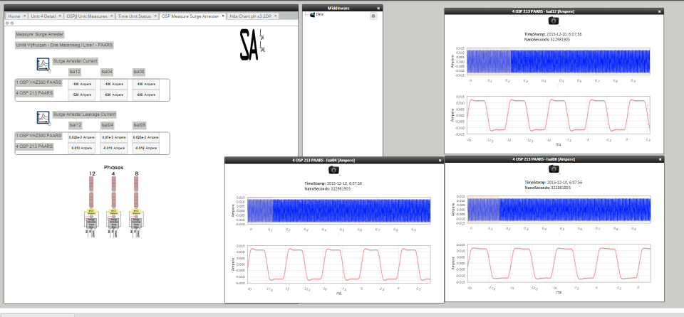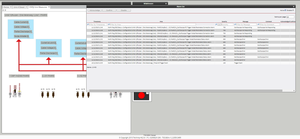 PCMONS安裝在荷蘭北部40公里的高壓電網中,分布在8個單元中,覆蓋13個地點和4個變電站。它由連接到主機放大器的機柜,Pico Technology的采集儀器和觸發邏輯組成。機柜通過光纖連接到每個單元的一個服務器,其中觸發信號被分配并且數據被收集并傳輸到中央單元。這是使用專有人機界面(HMI)軟件Techimp TiSCADA存儲數據進行可視化和分析的中央服務器。