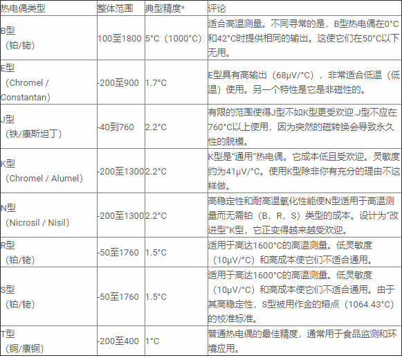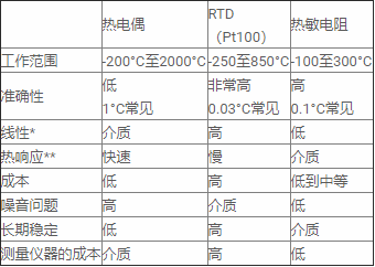 表1 - 最常用的溫度傳感器及其特性 *如果使用現代數字測量儀器,線性不是問題,因為存儲在存儲器中的查找表提供補償。 **僅對測量元件考慮熱響應,而不考慮其外殼。