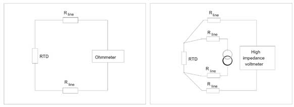 熱電阻 另一種常見類型的溫度測量裝置是電阻溫度檢測器 - 本文討論的三種傳感器類型中最穩定和準確(盡管價格昂貴且易碎)。任何金屬的電阻都根據其溫度而變化 - 在大多數情況下,電阻隨溫度升高而增加,據說具有正溫度系數(PTC)。 也許最常見的RTD類型是鉑電阻溫度計(PRT),其實際工作溫度范圍為-250至850°C。根據類型,RTD的精度在0.03到0.3°C之間。最常用的PRT是Pt100 - 因為它在0°C時具有100Ω的電阻。 PRT是線繞或金屬膜電阻器。其中,后者表現出更快的響應時間。由于Pt100傳感器基本上是一個電阻器,其值可以用歐姆表測量,如圖4所示。但是,傳感器的低電阻及其低靈敏度(0.385Ω/°C)使得由于引線電阻而難以進行精確測量。將Pt100連接到儀表的每根引線中的1Ω電阻將導致誤差超過5°C。 為避免引線電阻誤差問題,大多數Pt100測量均采用4線配置(圖4)。這里,兩根導線用于提供激勵電流,另外兩根導線連接PRT上的電壓表。如果電壓表的阻抗很高,則電纜中的幾歐姆電阻不會導致錯誤。 所示的2線和4線配置之間的折衷是所謂的3線測量。將此折扣用于高精度測量,因為它經常錯誤地假設所有三根導線具有相同的電阻。實際上,精確測量需要4線配置。此外,熱敏電阻通常比3線或4線Pt100測量具有更好的精度。