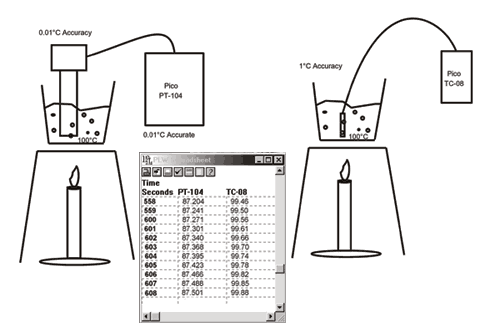 圖3:在該實驗中,使用高精度和低精度傳感器和儀器對來觀察被加熱的等體積水的上升溫度。將大型,昂貴且精確的Pt100傳感器連接到PT-104(均具有0.01°C精度)并部分浸入一個燒杯中,同時使用低成本熱電偶連接到TC-08(0.5°C精度),沉浸在第二個燒杯中。由于“熱分流”,以這種方式使用Pt100傳感器使傳感器和儀器的精度無效。從較大的,部分浸入的探頭向大氣中散熱會降低水的加熱速率。此外,在該實驗中,即使水沸騰,PT100的溫度也從未達到100℃。價格低廉, 在考慮了要測量的內容之后,下一步是確定要使用哪種類型的傳感器。研究和工業中最常用的三種傳感器是:熱電偶; 電阻溫度檢測器(RTD或'電阻溫度計'); 和熱敏電阻。表1比較并對比了三者。