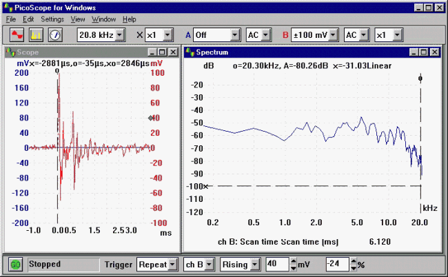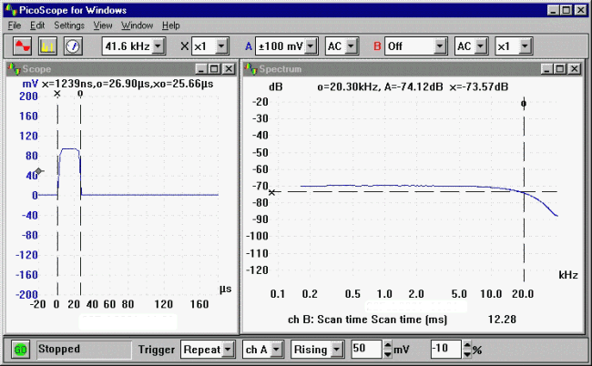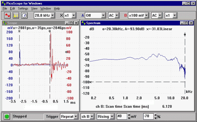 頻率響應測量 注意:如果要進行一組測量以進行比較,則必須對每個測量使用相同的設置。否則,測量的相對水平將是不同的。 對于本說明,假設脈沖gen的輸出在通道A中,而來自通道B中的麥克風的返回信號。 從脈搏開始。下面的屏幕顯示了脈沖及其頻譜(圖1)。 請注意觸發器和頻譜視圖的設置(有關詳細信息,請參閱PicoScope幫助文件)。 范圍視圖設置>選項設置為: ·'X scale'= Log Spectrum View Settings> Options設置為: ·'要顯示的數據'=當前。 ·'Y scale'= dB ·'窗口'=矩形 ·'沒有頻譜帶'= 512 ·'顯示模式'=正常 在光譜視圖設置>測量>測量列表>添加中: '測量'=掃描時間 '頻道'= ch A. 請注意,脈沖寬度為25μs,并且在20 kHz左右時具有3 dB的衰減。如果脈沖變長,則最高測量頻率下降。需要在以下兩者之間進行權衡:在脈沖中獲得足夠的功率以克服到達麥克風的背景噪聲和帶寬。功率放大器和揚聲器設置的脈沖高度有一個上限。如果您不想測量10 kHz以上,脈沖長度會提高噪聲性能。請注意,Spectrum View窗口是矩形的。不要將其與測量時間窗口混淆。要獲得揚聲器測量的良好效果,您可以嘗試更改“頻譜視圖”窗口。布萊克曼窗口可能是最好的。 設置脈沖長度后,您現在可以開始查看聲學輸出,您需要調整脈沖的重復率。設置通過揚聲器的脈沖并在PicoScope上觀察結果。 注意:設置觸發器以對麥克風信號進行操作。 下面的屏幕顯示了結果。請注意,來自麥克風的紅色脈沖相對于電氣(藍色脈沖)延遲超過2.8 ms。在這種情況下,測量距離為95厘米,這使我們測得的聲速為333毫秒-1 (一個很好的檢查?。▓D2)。