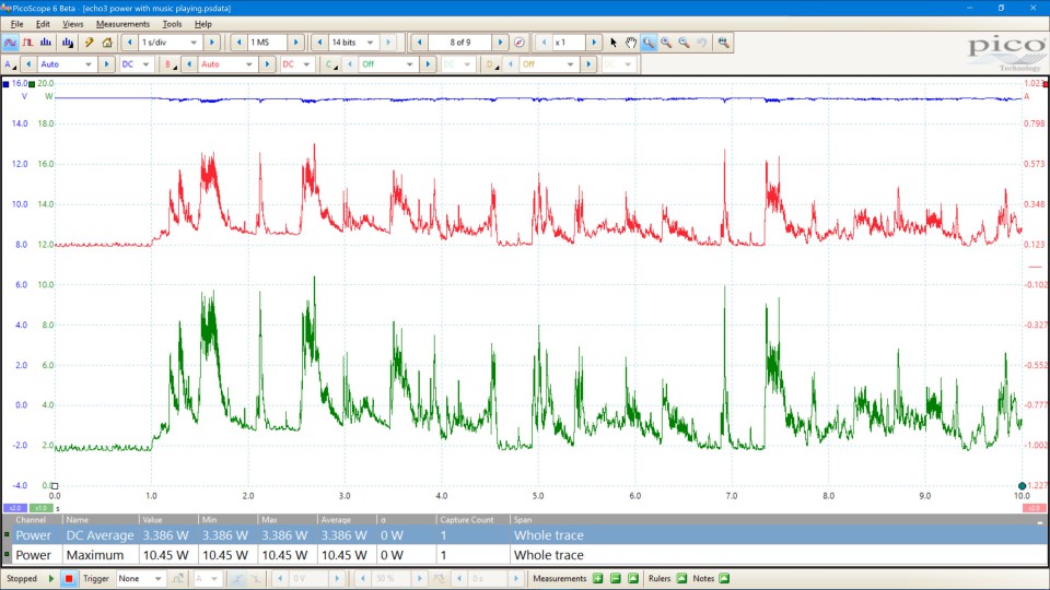 播放嘈雜的音樂 通過Echo設(shè)置以最大音量播放音樂,我們測量了電源電壓,電流和功率。所消耗的最大電流僅為771 mA,這表明1.5 A電源對于該器件來說已經(jīng)足夠了。在峰值電流時,15 V電源下降216 mV(1.4%)。 我們增加了平均功率(3.383 W)和峰值功率(11.58 W)的自動測量。
