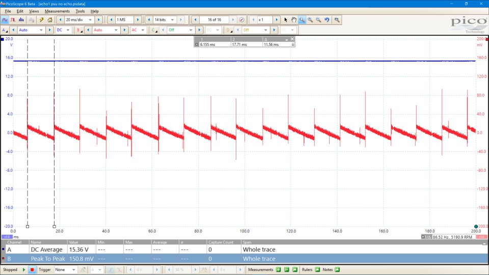 亞馬遜Echo電源 在測量Echo在不同模式下的功耗之前,我們快速查看了沒有連接Echo的開關(guān)主電源的輸出。我們使用通道A通過直流耦合(15.36 V)測量電壓。通道B在更敏感的范圍內(nèi)通過交流耦合測量相同的信號,顯示出大約150 mV的噪聲,頻率為86 Hz。 連接Echo后,直流電壓和紋波電壓相似(15.36 V和135.5 mV),但紋波頻率從86 Hz增加到19.64 kHz,這表明PSU在空載時跳過脈沖以提高效率。
