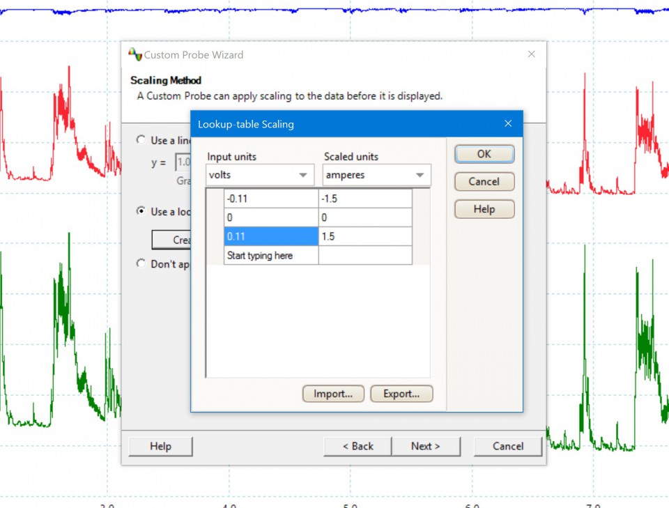 您可以使用PicoScope的自定義探頭功能將電阻上的壓降調(diào)節(jié)為安培。簡單的數(shù)學(xué)通道(V x I)允許您添加以瓦特為單位的功率顯示。