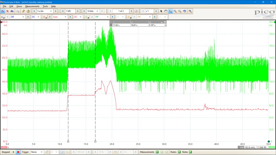待機功率 由于Amazon Echo被設(shè)計為在等待命令時保持打開狀態(tài),因此了解它在此空閑狀態(tài)下使用的功率非常重要。為了衡量這一點,我們將Echo置于待機模式,然后將其喚醒并要求它以低設(shè)置播放音樂(第3卷)。 綠色跡線顯示全帶寬時的電流波形,開關(guān)噪聲使得難以觀察信號。紅色跡線在PicoScope中應(yīng)用了10 Hz軟件濾波器以清除跡線。 第一個11.6秒顯示Echo處于待機狀態(tài),當(dāng)時它正在繪制114 mA(1.71 W)。 一年多來,假設(shè)典型的PSU效率為85%,Echo將使用大約18 kWh。這使您的電費增加約2.20英鎊(約合2.70美元或2.50歐元),英國每千瓦時的平均國內(nèi)價格為0.126英鎊。 當(dāng)Echo檢測到命令并通過Wi-Fi傳輸時,標(biāo)尺之間的區(qū)域顯示功率跳躍。令人驚訝的是,當(dāng)以低設(shè)置播放音樂時,所消耗的電流幾乎與待機時的電流相同(117 mA對114 mA),因此無論Echo處于待機狀態(tài)還是在后臺靜音播放音樂,您的電費都會有所不同。