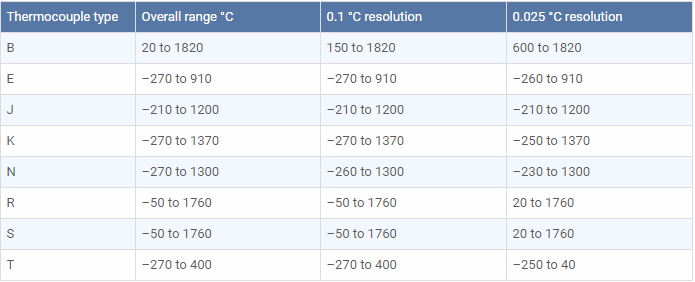 范圍和靈敏度 選擇熱電偶類型時,請確保您的測量設備不限制可測量的溫度范圍。下面列出的是8通道Pico TC-08熱電偶數據記錄儀可以測量的溫度范圍。請注意,低靈敏度(B,R和S)的熱電偶具有相應較低的分辨率。