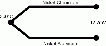 熱電偶是最受歡迎的溫度傳感器。它們便宜,可互換,具有標準連接器,可以測量各種溫度。主要限制是準確性:可能難以實現低于1°C的系統誤差。 1822年,一位名叫Thomas Seebeck的愛沙尼亞物理學家發現,兩種金屬之間的連接產生的電壓是溫度的函數。熱電偶依賴于塞貝克效應。盡管幾乎任何兩種類型的金屬都可以用于制造熱電偶,但是使用了許多標準類型,因為它們具有可預測的輸出電壓和大的電壓/溫度梯度。該圖顯示了K型熱電偶,這是最受歡迎的。