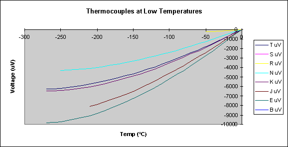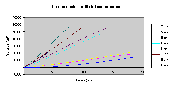 圖表顯示了不同溫度下熱電偶的電壓輸出。請注意,鉑基熱電偶的輸出功率非常低,這就解釋了為什么它們的使用僅限于測量高溫。
