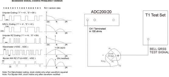 該實(shí)驗(yàn)演示了ADC-200/20示波器如何查看T1數(shù)據(jù)通信代碼以及簡單電路如何改變代碼以恢復(fù)嵌入式時鐘信號。下圖說明了各種基帶數(shù)據(jù)代碼及其各自的頻譜。T1信號是雙極AMI RZ。