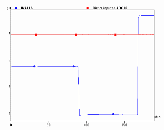 根據歐姆定律:Es = IRs + IRm 由于Rs幾乎是Rm的100倍,因此測量裝置僅測量約1%的Es。因此,測得的電位將非常小并接近于零。當我們將這些值替換為pH = 7.00 - (X / 59.1) - 其中X非常小(接近零)時,我們可以理解為什么ADC-16將在連接到玻璃電極的情況下測量約7的pH值它直接與溶液的pH值無關。該預測在圖5所示的實驗中得到驗證。在該實驗中,將兩個玻璃組合電極一起浸入不同的緩沖溶液中。其中一個電極連接到4-Ch模塊中的Ch1,另一個電極直接連接到ADC-16的通道5。由于ADC-16只能測量很小一部分電池電位, 你能想到使用這種多聲道錄音的另一個好處嗎? 使用多于電極測量相同的參數(例如pH或其他離子濃度)可以提供增強信噪比的平均值。PicoLog的“計算參數”功能有助于直接繪制4個通道的平均值。