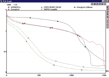 有沒有想過哪個商用電池實際上持續時間最長?ADC-16是回答這個問題的理想工具。 此實驗需要以下設備: ADC-16數據記錄器 精選的1.5伏(AA)電池 電池座可容納電池 每個電池的負載電阻。 為了使電池放電,必須承受負荷。負載的大小將決定電池放電的速度。選擇負載時,必須考慮實驗可以運行多長時間。 AA電池的容量可以變化很大,因此為了確定負載電阻,必須進行一些計算。歐姆定律可用于推導負載電阻: - Rload = V / I. 其中V是電池電壓,I是電池電流。首先必須通過花費實驗的持續時間來推導出電流,例如。如果實驗持續20小時,并且最大容量的電池額定為2700 mAh,那么每小時的電流將為135 mA(2700 mA / 20小時)。 現在可以計算Rload: Rload = 1.5 V / 0.135 A =11.1Ω 這些計算只能用作粗略估計,因為電池電壓在放電時會不斷變化。在這個例子中,Rload取10歐姆。 在端子板上的位置P1,P2,P3,P4和P5焊接一個10歐姆的負載電阻。然后將支架中的電池連接到通道1至5。