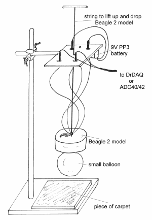 實驗設置 火星著陸器Beagle 2由一小塊水泥建模。在其下側是力傳感器,其產生與施加在其上的力相關的輸出電壓。力越大,輸出電壓越高。該傳感器將連接到基于計算機的示波器,以顯示模型在著陸期間發生的情況。 一旦模型構建完成后,如技術人員的說明所示,將模型的懸架和連接系統放入高反彈架頂部的凸臺中,并連接DrDAQ或ADC-40/42和相關計算機,如圖所示在下面的圖3中。