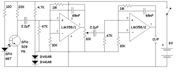 放大器 放大器(見圖3)使用LM358雙運算放大器提供兩個相同的寬調諧帶通階段,增益為100.同樣,運算放大器的類型并不是特別關鍵,只要它能工作在6V并驅動輸出軌到軌。信號頻率由低端的運動偽影(由栓釘移動和扭曲下面的組織產生;光釘更好)和頂端的電源 - 嗡嗡聲干擾。該電路采用單個6伏電池供電,輸出零點通過將所有內容參考由一對正向偏置硅二極管設置的電壓的內部公共線偏移約1伏。這對于具有0-5V輸入的接口很方便。電位計允許調整整體增益,以防止對大信號進行削波。元件并不重要,但兩個2.2μF電容必須能夠承受一些反向偏壓,因此它們應該是非極化的或鉭的。該電路可以很容易地在一小塊條板上制成。
