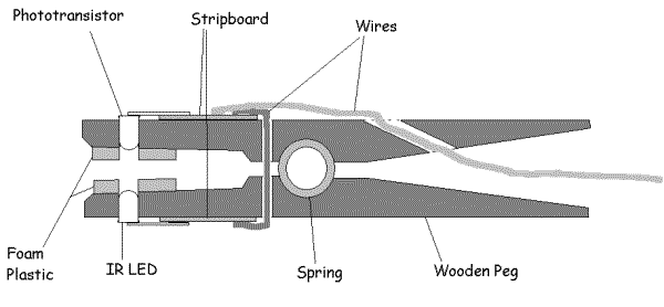 傳感器由光源和光電探測器組成; 光線照射在組織中,血量的變化會改變落在探測器上的光量。源和檢測器可以并排安裝,以觀察反射光的變化或手指或耳垂兩側的變化,以檢測透射光的變化。這里的特殊布置使用木制衣夾來固定紅外發光二極管和匹配的光電晶體管(見圖1和2)。光電晶體管的紅外濾光片減少了熒光燈的干擾,熒光燈的輸出中有大的交流分量。