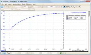 進行實驗 通過懸空引線短接其端子來使電容器放電。按PC上的空格鍵并關閉開關。應該獲得類似于所示的痕跡。根據需要調整時基設置并重復運行。要重復運行,請打開開關,使電容器放電,按下PC上的空格鍵并再次關閉開關。保存屏幕圖像。
