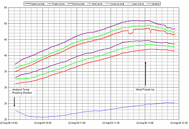 紫色汽車的空氣溫度為51°C,座椅溫度為45.8°C 綠色汽車的空氣溫度為49.5°C,座椅溫度為43.5°C 紅色汽車的空氣溫度為48.5°C,座椅溫度為42°C 車外溫度達到26°C
