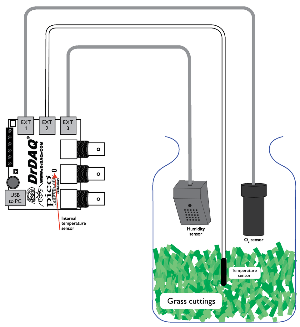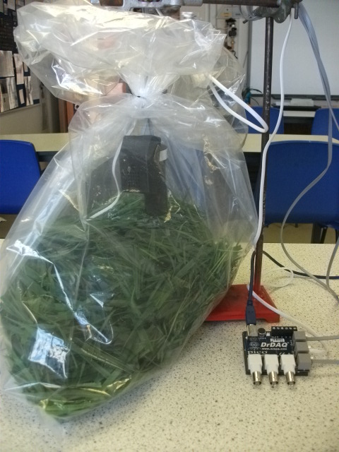 實驗設置 設備如圖所示設置。氧氣和溫度(和濕度)傳感器連接到DrDAQ數據記錄器,然后將其插入PC。 將鮮草插入袋中。可以將袋子放入隔熱袋中以防止熱量損失。溫度傳感器插入草屑的中間。氧氣傳感器(和濕度傳感器)懸掛在草屑上方,袋子系在傳感器電纜周圍,從而確保氧氣傳感器不會落入草屑中。支架和夾具可用于支撐傳感器電纜。 PicoLog設置為每分鐘一個樣本記錄,最多600個樣本(即10個小時的數據)。您可以使用DrDAQ上的溫度傳感器記錄室溫,這樣您就可以檢查可能影響實驗的任何大的背景溫度變化。然而,草屑形成了良好的絕緣體,因此這不是很重要。該圖設定為顯示氧含量和溫度。電子表格設置為顯示氧含量,溫度和室溫。如果將電子表格設置為每隔5或10次讀取一次,則更容易查看電子表格(單擊電子表格顯示的側面菜單中的“選項”)。請注意,在實驗開始之前,DrDAQ上的溫度傳感器顯示的讀數略高于外部溫度傳感器,
