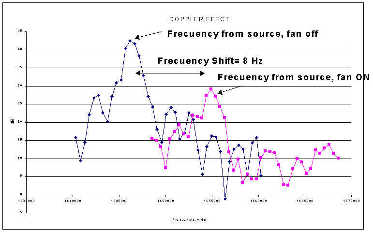 我們可以使用估計的空氣速度(6.0 kph)和保存的數(shù)據(jù)來驗證實驗生成的數(shù)據(jù)質(zhì)量,檢查全頻譜的頻率變化。 STEP1.txt 和 STEP2.TXT 我們將STEP1.TXT文件導(dǎo)入 Excel工作表并應(yīng)用多普勒效應(yīng)方程來計算低頻和高頻頻率的變化。將這些計算出的頻率與頻率進行比較,STEP2.TXT我們將觀察到頻率(2-500Hz)的低中頻范圍內(nèi)的頻率(mHz)的低變化。我們繪制Excel工作表中的數(shù)據(jù),如圖3所示。