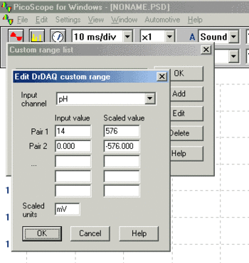 1.選擇文件>設置>自定義范圍 2.在自定義范圍列表中選擇添加 3.輸入圖所示的設置(圖2) 4.使用通道A的下拉菜單選擇pH,范圍為±576 mV 5.DrDAQ屏幕現在看起來應該與圖3中顯示的圖像相同