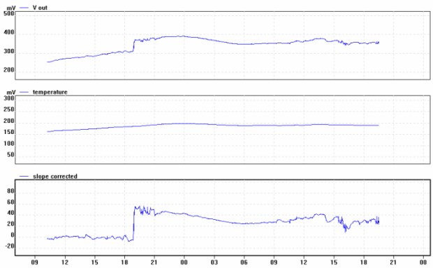 這顯示了福特Ka從房屋前面的通常停車位(離傳感器大約100英尺)移動(dòng)的影響,然后更換。從蹤跡中你可以看到汽車進(jìn)行了三次旅行 - 一次是從大約08:00到08:45,另一次是從11:20到13:15,最后一次是從15:15到16:30。有趣的是,在Ka缺席期間,一輛明顯更大的Land Rover Discovery被停放在同一個(gè)地方,但是由于是由鋁制成的,因此沒有顯示出痕跡。