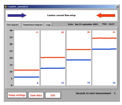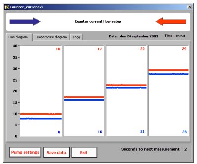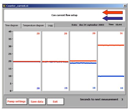 上面的圖4是使用并流設(shè)置產(chǎn)生的,其中溫水和冷水都從右側(cè)進(jìn)入熱交換器。從實(shí)驗(yàn)中可以明顯看出,發(fā)生的最大交換是50% - 一旦兩個(gè)溫度相等,就不可能進(jìn)行進(jìn)一步的凈交換。 下面的圖5顯示了通過交換器的低流速的逆流實(shí)驗(yàn)的結(jié)果。當(dāng)冷水從左側(cè)進(jìn)入時(shí),溫水從右側(cè)進(jìn)入交換器。如圖所示,這是一種非常有效的交換方式。溫水進(jìn)入29°C并在10°C離開,而冷水進(jìn)入8°C并在28°C離開。