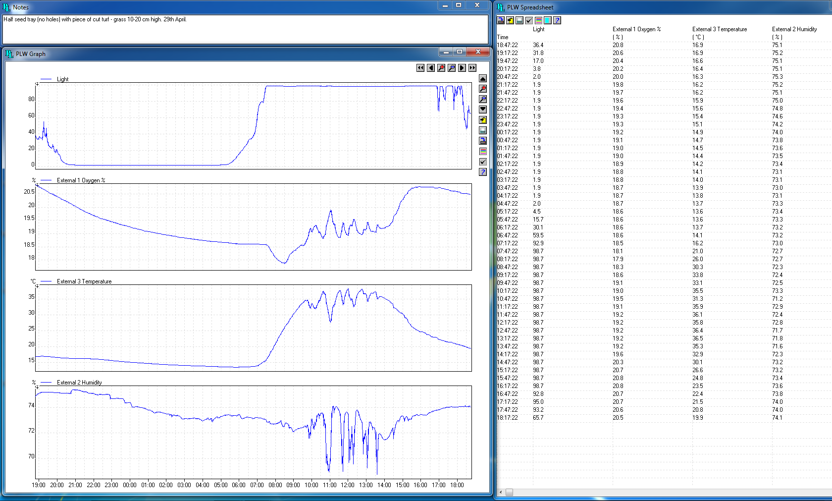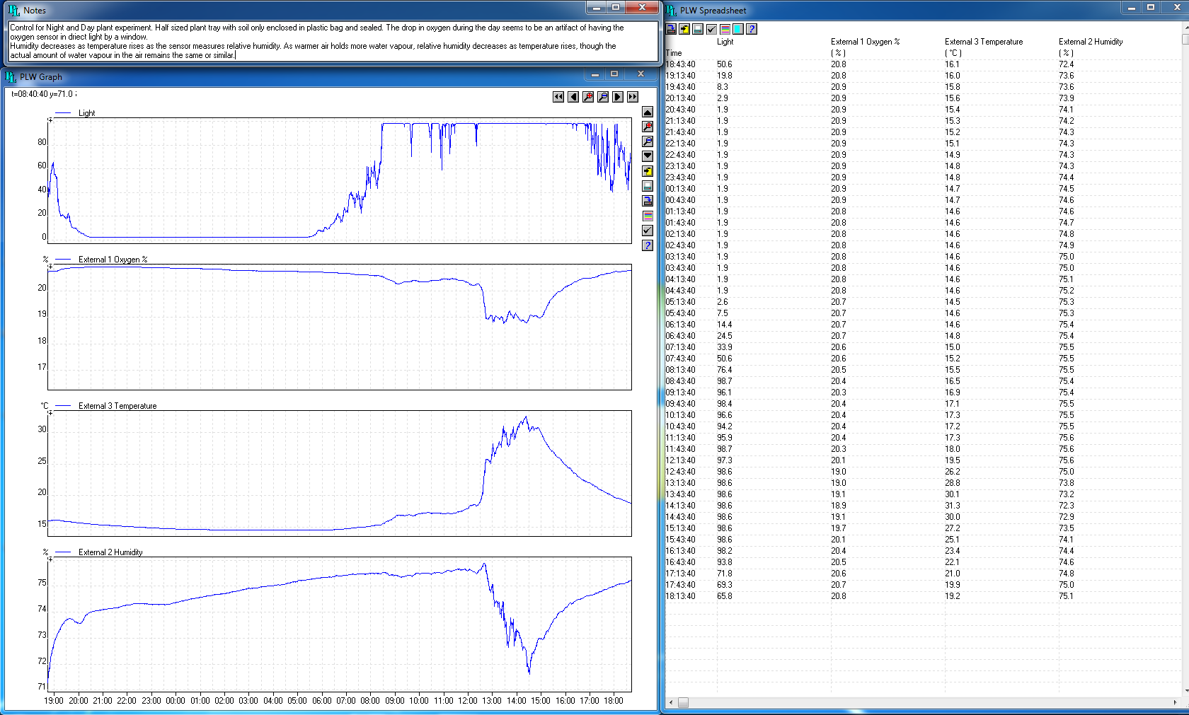 結果 這個實驗進行了24小時,從4月底的晚上19:00開始。日落時間為20:18。最上面的一組圖表清楚地表明,氧氣水平在一個密封的袋子中過夜,一個生長的草皮托盤。光線顯示在頂部圖表中。日出后幾小時氧氣水平上升,呈現上升趨勢,直到光線水平開始消退后再次開始下降。濕度圖表相當復雜,在夜間逐漸下降,隨后急劇下降。白天塑料袋上有水滴凝結,這可能解釋了急劇的下降。DrDAQ測量相對濕度,因此可以預期隨著溫度升高,這將會下降,因為暖空氣將保持更多的水蒸氣。白天的高溫可歸因于光線直接落在傳感器上。室溫為20°C而不是30°C。 氧氣水平的變化似乎不是很大,但17.9%的最低水平被認為是非常缺氧的。空氣的氧含量約為20.9%,安全監測器通常設定為氧氣含量為20.5%。低于18%被認為是危險的。 對照實驗在一天后的同一時間范圍內進行,潮濕的土壤在同一個托盤中,沒有草。隨著溫度的升高,這表明濕度下降(參見上文關于相對濕度的評??論)。隨著光照水平和溫度上升,氧氣水平也下降,然后隨著溫度和光照水平在晚上下降而恢復到接近原始水平。沒有明顯的原因導致這種氧氣水平的變化,但它的體積要小得多,并且與生長的草實驗相反。它可能是將氧傳感器置于直射光下的人工制品。