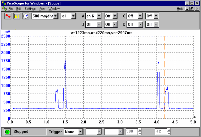 結(jié)果 總體思路是跟蹤汽車完成電路所需的時(shí)間。請(qǐng)參閱下面的PicoScope顯示屏,了解其工作原理示例: