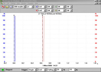 下面的PicoScope顯示屏顯示了獲得的結果。PicoScope標尺用于測量兩個峰之間的時間間隔。