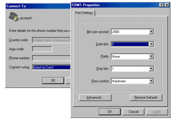 現在您必須設置終端參數。在文件下,找到新連接。將連接命名為Picotech,然后單擊“確定”。將出現“連接到”框。選擇Connect using參數以直接連接到Com1(假設使用的串行端口是Com1。請查看PC手冊以了解串口設置)。單擊“確定”。接下來出現端口設置框。 接受下面列出的參數: 每秒位數= 2400 數據位= 7 奇偶校驗=無 停止位= 1 流量控制=硬件 最后在File下,轉到Properties參數并選擇Settings選項卡。轉到ASCII設置并選中本地Echo類型字符框。保存Picotech.htm下的所有設置。終端程序現已設置完畢。正確的設置如下圖4所示。