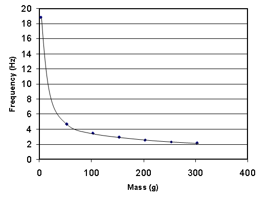 圖2顯示了碳纖維復合梁的典型自由振動響應,其自由端連接有100 g。 這里的振動頻率約為3.5Hz: 在1.9s和4.75s之間的10次振動(2.85s) 因此周期T = 2.85 / 10 = 0.285s 頻率(由1 / T給出)= 3.5Hz。 圖3顯示了連接到梁自由端的質量與梁的自由振動響應之間的典型反比關系。根據您使用的梁的剛度,如圖3所示的曲線可以向上或向下移動。然而,反比關系保持不變。
