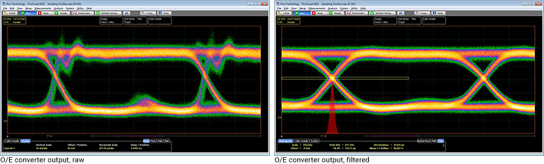 PicoScope 9321-20包含一個內置的精密光電轉換器。通過轉換器輸出連接到示波器輸入之一(可選擇通過SMA脈沖整形濾波器),PicoScope 9321-20可以分析標準光通信信號,如OC48 / STM16,4.250 Gb / s光纖通道和2xGB以太網。該示波器可以通過自動測量光學參數進行眼圖測量,包括消光比,S / N比,眼高和眼寬。憑借其集成的時鐘恢復模塊,示波器可用于11.3 Gb / s。