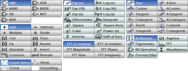 ·雙輸入運算符:反轉,絕對,指數,對數,微分,積分,逆,FFT,插值,平滑。