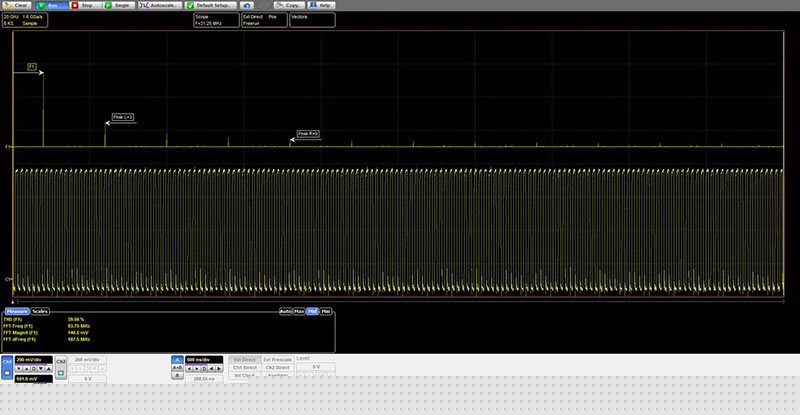 所有PicoScope 9300系列示波器均可使用一系列窗口函數計算輸入信號的實數,虛數和復數快速傅里葉變換。可以使用數學函數進一步處理結果。FFT可用于發現串擾和失真問題,調整濾波器電路以濾除波形中的某些諧波,測試系統的脈沖響應,以及識別和定位噪聲和干擾源。