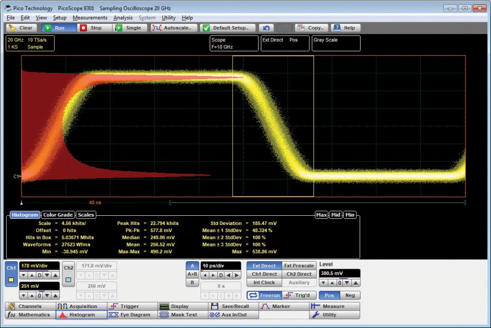 PicoSample 3工作空間充分利用了您可用的顯示尺寸和分辨率。您可以決定為跟蹤顯示和測量顯示提供多少空間,以及是否打開或隱藏控制菜單。用戶界面完全可觸摸或鼠標操作,可以抓取和拖動軌跡,光標,區域和參數。放大的參數控制用于較小的觸摸顯示器。要進行縮放,可以繪制縮放窗口或使用更傳統的雙時基,延遲和縮放控件。