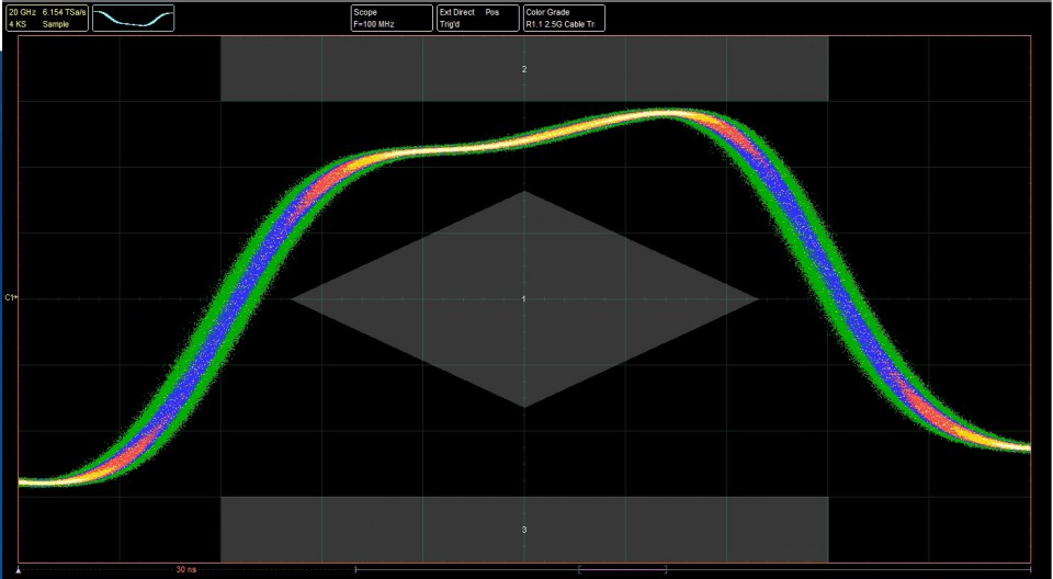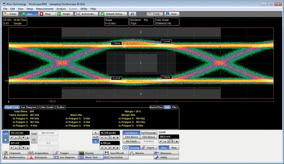 可選擇灰度和顏色分級顯示模式,以幫助分析眼圖中的噪聲和抖動。還有一個統計顯示,顯示原始掩碼和邊距的失敗計數。