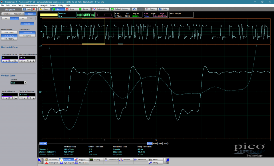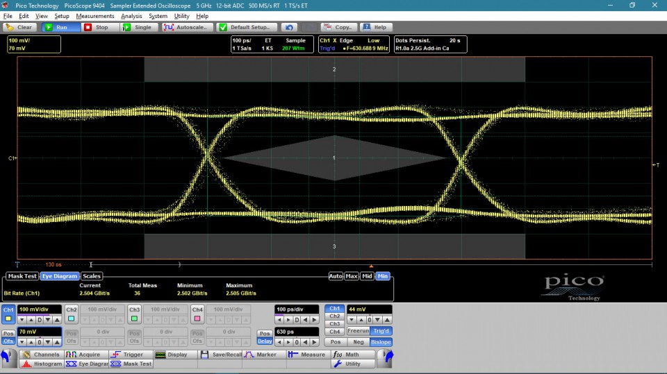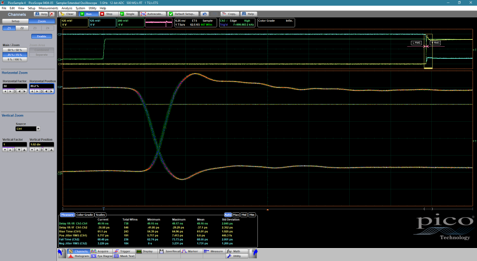 獨特的是,PicoScope 9404 SXRTO在ETS中的最大有效采樣率為1 TS / s。這相當于僅1 ps的定時分辨率,比其實際最大采樣率高20,000倍。