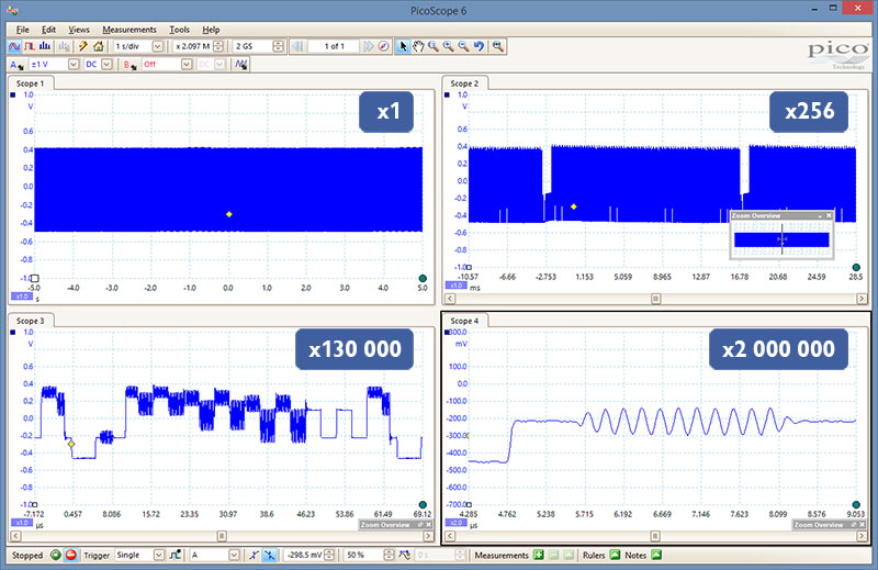 管理所有這些數據需要一些工具。有一組縮放按鈕,以及一個概覽窗口,只需用鼠標或觸摸屏拖動即可縮放和重新定位顯示。幾百萬的縮放因子是可能的。其他工具,如波形緩沖器,模板限制測試,串行解碼和硬件加速與深存儲器配合使用。