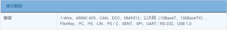 PicoScope可以解碼1-Wire,ARINC 429,CAN&CAN-FD,DCC,DMX512,以太網10Base-T和100Base-TX,FlexRay,I2C,I2S,LIN,PS / 2,MODBUS,SENT,SPI,UART(RS)標準配置為-232 / RS-422 / RS-485)和USB 1.1協議數據,開發中有更多協議,將來可通過免費軟件升級獲得。