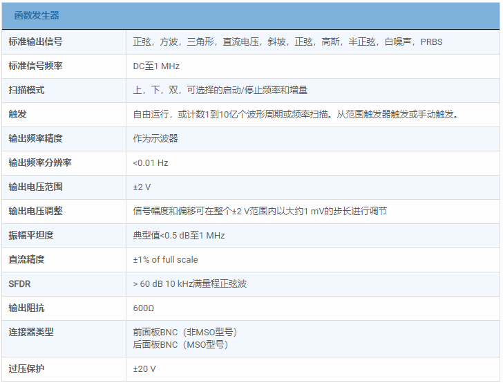 這些示波器提供2或4個模擬通道和一個內置功能/任意波形發生器。MSO模型增加了16個數字頻道。關鍵性能指標: