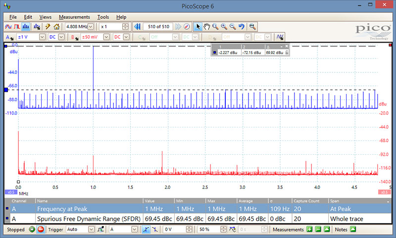 頻譜視圖根據頻率繪制幅度,非常適合查找信號中的噪聲,串擾或失真。PicoScope中的頻譜分析儀采用快速傅立葉變換(FFT)類型,與傳統的掃描頻譜分析儀不同,它可以顯示單個非重復波形的頻譜。
